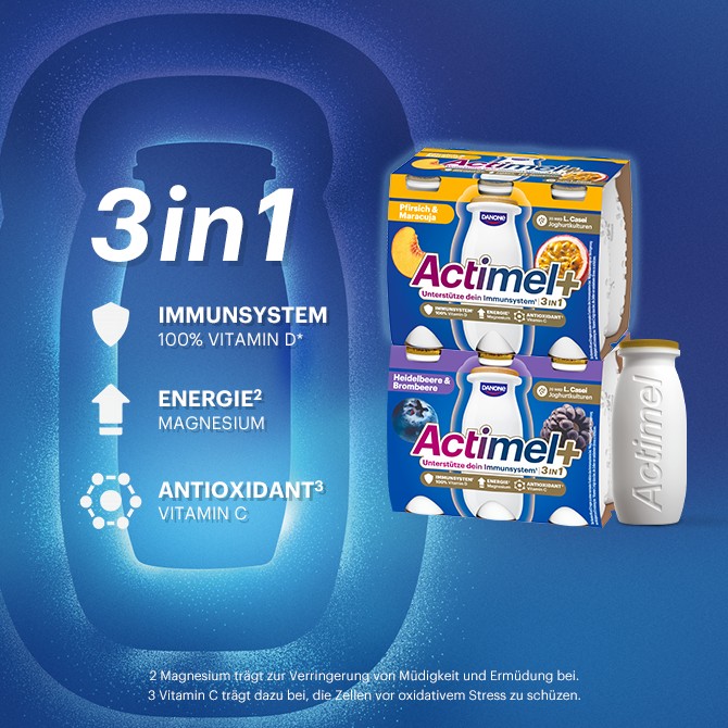 Unsere einzigartigen L.Casei Joghurtkulturen leisten unaufhörlich Widerstand und überleben in großer Anzahl den Weg zum Darm. Zusätzlich ist Actimel mit den Vitaminen B6 und D angereichert, um dein Immunsystem zu unterstützen.*
